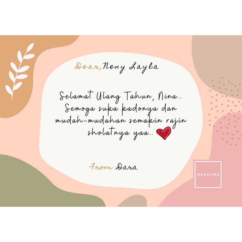 Sahabat Nakajima yang mau kirim kado ulang tahun atau hadiah lebaran Mukena Nakajima, bisa order kartu ini untuk ucapannya yaa